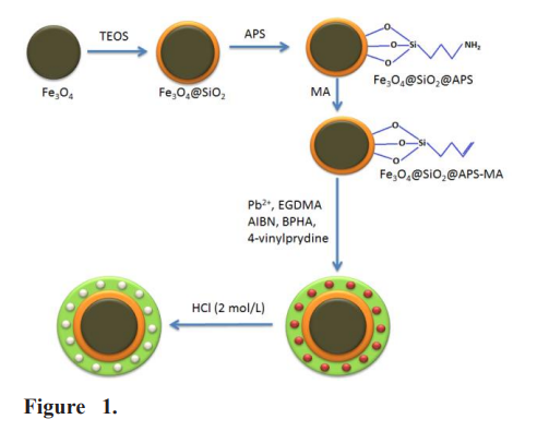 Ferric chloride, sodium acetate, ammonium hydroxide and tetraethyl orthosilicate (TEOS) were used for synthesis of Fe3O4@SiO2 nanoparticles and for the functionalization. Triethylamine (TEA) and 3-aminopropyltriethoxysilane (APS) were applied for the preparation of the imprinted polymer, utilized from 4-vinyl pyridine (VP), n-benzoyl-n-phenyl hydroxylamine (BPHA), ethylene glycol dimethacrylate (EGDMA), maleic anhydride (MA) and α, α’-azobisisobutyronitrile (AIBN). Pb(NO3)2 were used as source of Pb(II). Stock solutions were prepared daily from Pb2+ standard solution of 1000.0 mg L-1 by serial dilutions. Other chemicals were provided from Merck Company (Darmstadt, Germany). Deionized water was used for preparation of all solutions.