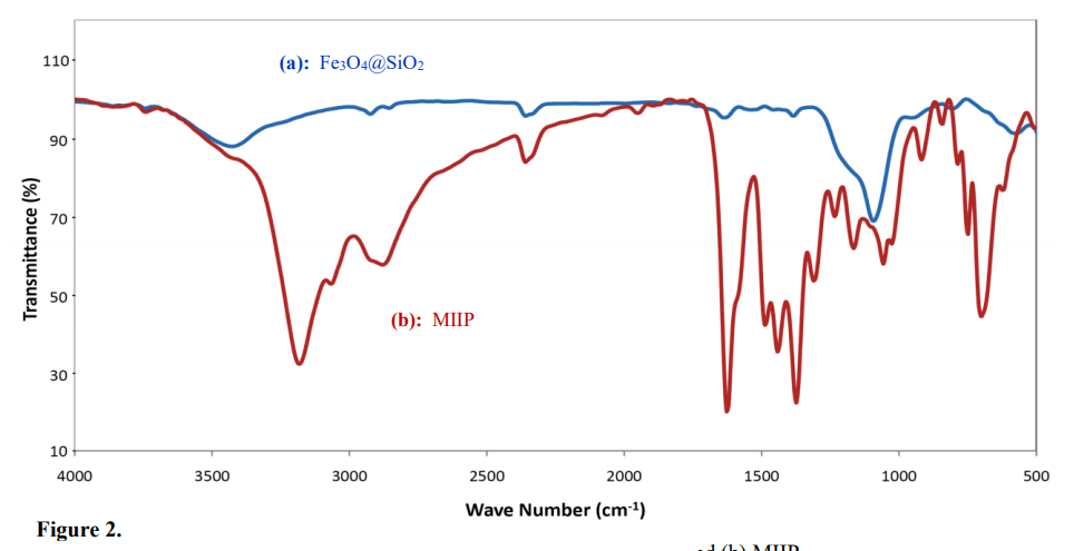 The FT-IR spectra of Fe3O4@SiO2 and MIIP showed in Fig. 2. The peak at 1150 cm-1 is corresponding to Si-O-Si stretching that observed in both of samples, which indicates SiO2 is encapsulated correctly inside the MIIP. The carbonyl peak at 1730 cm-1, O-H peak at 3205 cm-1 and C-N peak at 1450 and 1380 cm-1 showed the presence of ligand (BPHA) in the MIIP structure.