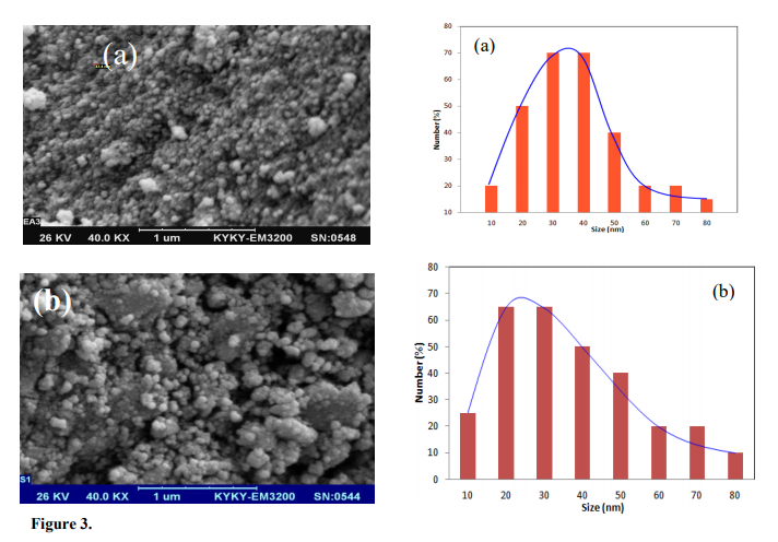 The morphology and particle size histograms of the synthesized adsorbents were analyzed via SEM system and ImageJ software. The results of the MNIIP and MIIP nanoparticles are shown in Fig. 3(a, b). SEM image of Fig. 3a shows a homogenous and smooth surface for MNIIP nanospheres with particle size range of 30-40 nm that obtained from ImageJ software usage. As shown in SEM image of Fig. 3b, in the presence and then removing of Pb(II), a porous structure was resulted for MIIP which was attributed to imprinted cavities. This rough structure of this surface on the surface of MIIP is favor to mass transfer and the formation of three-dimensional recognition sites. In this manner the particle size range of MIIP was obtained 20-30 nm.