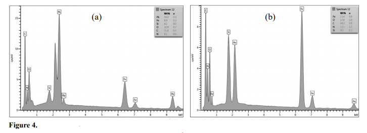 The EDX spectrums of MIIPs after adsorption and then elution of Pb(II) are shown in Fig. 4(a, b) respectively. As seen in Fig. 4a the spectrum of the no leached MIIP revealed that significant amount of the analyte was adsorbed in the sorbent from the initial solution. Also Fig. 4b related to the leached MIIP confirmed the elimination of lead in the sorbent after rinsing with the selected eluent.