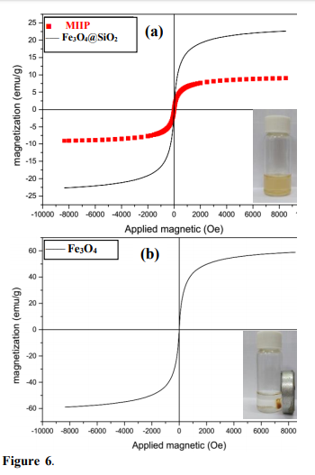 The magnetic properties of the, Fe3O4@SiO2, Pb(II)-MIIP and Fe3O4 were characterized using vibrating sample magnetometry (VSM) technique in the magnetic field of -10,000 to +10,000 Oersted at 25 °C. As shown in Fig. 6, the hysteresis curve of these samples is fully reversible that means nanomaterials have superparamagnetic properties and could be easily and quickly separated from a suspension. The saturation magnetization value of Fe3O4, Fe3O4@SiO2 and MIIP was about 59, 23 and 9 emu g-1, respectively. The value of saturation magnetization was decreased by increasing modifying steps. The decrease in magnetization value can be attributed to the existence of IIP on the surface of the Fe3O4@SiO2 nanoparticles. Also, this relationship can be seen in the comparison between Fe3O4@SiO2 and Fe3O4. However, the MIIP with less magnetite encapsulation possesses enough magnetic response to meet the need of magnetic separation.