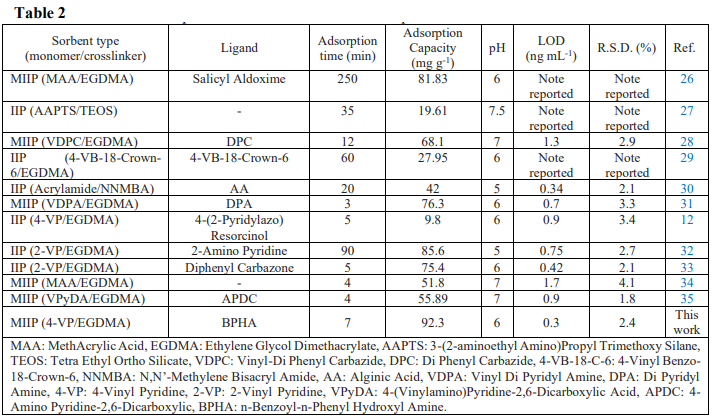 Table 1 summarizes the analytical characteristics of the MIIP under the optimal conditions. The LOD of the proposed method was determined by 7 times placing of 0.2 g MIIP in 100 mL blank solutions and it was obtained to 0.3 µg L-1. The precision (RSD, %) for 7 replicate uptaking of 10 µgL-1 Pb(II) was 2.4%. Also, the linear dynamic range of the calibration curve was obtained in 2-150 µg L-1 range.