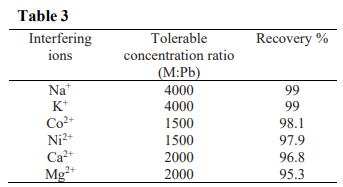 Table 2 showed a comparison between the presented work and some others for preconcentration of lead (II). As seen the analytical merits of the proposed method (e.g. adsorption time, adsorption capacity, detection limit and precision) are comparable and in general it is better than with those published reports. The main advantages of this method are more adsorption capacity and lower LOD.