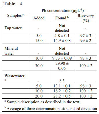 The proposed procedure was applied for determination of lead content in two environmental samples and a waste water (from an ammonium perchlorate factory) solution. The amounts of Pb(II) ions were determined in the final eluents and the results are listed in Table 4. As seen, the mean recoveries for different spiking of Pb2+ are in the range 96.6-99.7%. Therefore, the proposed MIIP can be applied for the determination of lead in various samples.