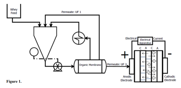 Electrodialysis (ED) is an electrochemical technique and shows benefits when compared to traditional processes, since it does not require phase change or addition of chemical reagent, as well as its operational cycle is continuous. It has been widely used in water and wastewater treatment for the removal of ions, for example, ionic species in solution are transported in compartments of a cell through ion-selective, anionic and cationic membranes by the action of an electric field. In addition to this, electrodialysis is an alternative11,12, method of lactose separation and concentration, when whey solutions are used.