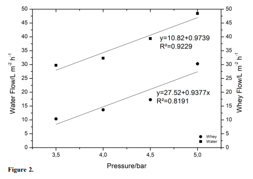The results of water and whey flux vs. transmembrane pressure are shown in Fig. 2. It is possible to observe that the water flow increased linearly in function of the TMP (r2 = 0.9229), and for whey solutions the behavior was linear with different slope. The same behavior was found in another study13.