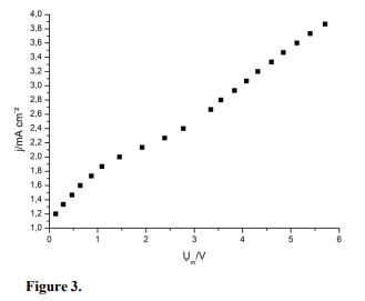 A typical current-potential of the membrane (Um) curve observed in working ED unit is depicted in Fig. 3, for the electrodialysis of a 0.1 mol L-1 CaCl2 solution. For the cationic membranes evaluation, the second region (plateau) in the graphic of Fig. 3 determines a limiting current between 1.79 and 2.02 mA cm-2 with cell potential (Ecell) around 13 V. After this evaluation, the limiting current was also determined using the work solution (whey), and the results were comparable.
