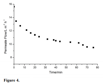 The phenomenon of permeation flux reduction must be evaluated to avoid compromising the application of ultrafiltration technique in real systems (scale up). In this study, the whey solution has a pH of 6.2, soluble total organic carbon (TOC) of 8.1 g L-1 and total nitrogen of 3.5 g L-1.