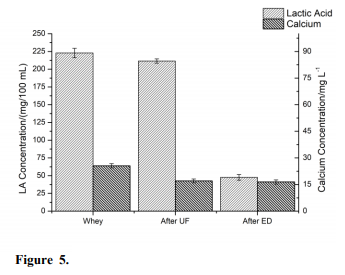 After the UF and ED processes, the pH remained unchanged, and the initial turbidity was reduced by 99.93%. The calcium concentration was decreased in 36% in the permeate solution, the lactic acid concentration in 80% (after UF + ED), and the TOC was reduced in 56%.
