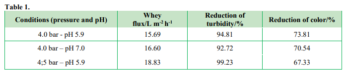 The evaluation of the ultrafiltration technique was performed by monitoring the turbidity and reduction of color (Co-Pt). In Table 1, results of whey flux (L m-2 h-1), reduction of turbidity and color are shown, and in this ultrafiltration system, the best results were obtained using pressure at 4 bar and pH 5.9.