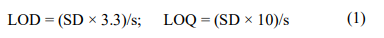The slope (s) of the calibration curve and the standard deviation (SD) of the three calibration curves were considered, taking into account the intercept with the Y-axis. These data are used in the equations to obtain LOD values and LOQ, that is, the smallest amount of marker that can be detected and quantified, respectively: