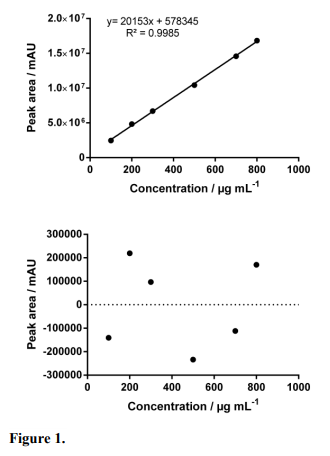 The method presented a linear response in the range of 100 to 800 μg mL-1 of concentrations. This correlation was made between the area of the peaks and their respective concentrations in triplicate. According to the Brazilian legislation, the correlation coefficient should be higher than 0.9900, and the method under study had a correlation coefficient of 0.9992, according to the requirements, demonstrating the linearity of the method15. From the linearity curve, LOD and LOQ were obtained: 1.12 μg mL-1 and 3.39 μg mL-1, respectively. The linearity and dispersion of residues graph are shown in Fig. 1.