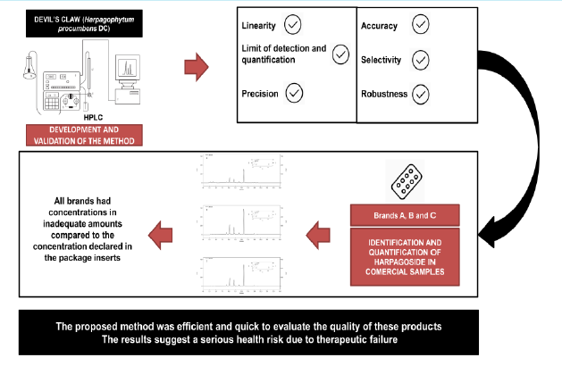 Therefore, this study aimed to develop and validate an analytical method using HPLC to contribute to the establishment of quality parameters for the finished product of this widely used medicinal plant, as well as to identify and quantify the harpagoside in commercial samples.