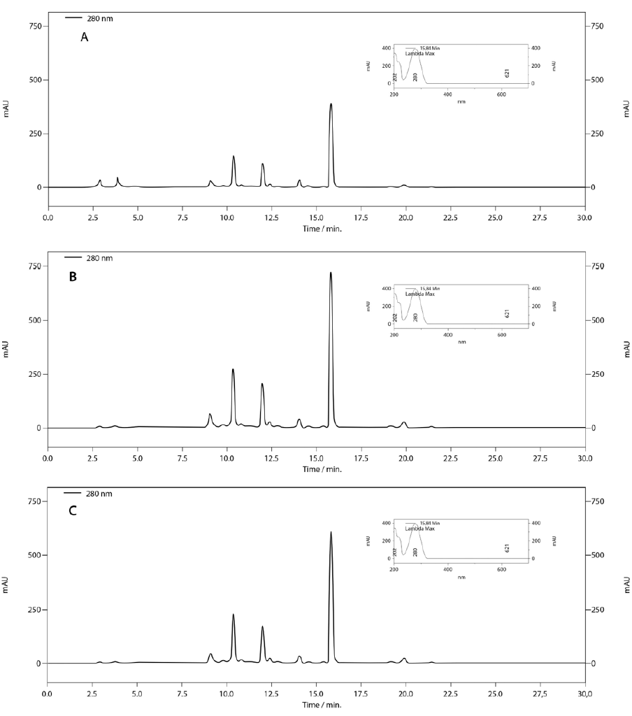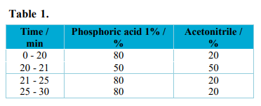 The method was optimized for a 30 min analysis time (while the original method was 55 min) using a C18e Purospher Star reverse phase column (150 × 4.6 mm, 5 µm). The mobile phase used was a gradient of 1% phosphoric acid and acetonitrile using a flow rate of 0.6 mL min-1, injection volume of 10 µL and the chromatograms extracted at 280 nm wavelength.