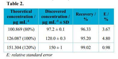 In this study, the accuracy evaluation was done using the standard addition method, using nine determinations with three levels of theoretical concentration (low, medium and high) in triplicate for each level. In the case of finished product, according to the Brazilian legislation, if samples of all drug components are unavailable, analysis by the standard chemical addition method may be performed, in which know quantities of reference chemical are added to the solution of the finished prduct17. The theoretical concentrations used were calculated at 80, 100 and 120%; these concentrations were achieved using 500 μL of the commercial H. procumbens sample with 500 μL of the harpagoside standard. The harpagoside recovery percentage added to the sample was evaluated by the relation between the experimentally determined concentration and the corresponding theoretical concentration.