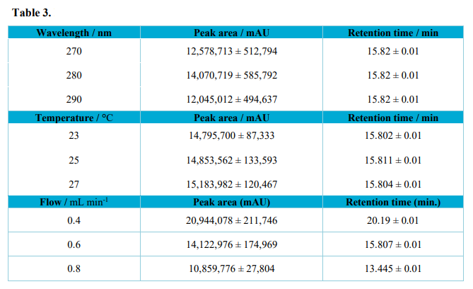 The parameters chosen for the variation were temperature (23-27 °C), wavelength (270-290 nm) and flow of the mobile phase (0.4-0.8 mL min-1). From these variations, the effects on the retention time and peak area were observed to evaluate if the method was robust.