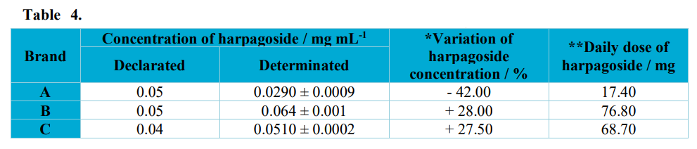 The proposed method in this study for the identification and quantification of harpagoside in the herbal medicine devil’s claw was efficient and quick to evaluate the quality of these products to ensure authenticity, credibility, safety and therapeutic efficacy. The obtained results emphasize the importance of quality control since we observed, in all three medicinal products, significant variations in the quantity of harpagoside in comparison to the value declared in the registry of these products.