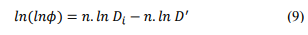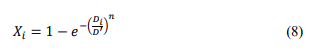 (9)where: Xi = passing weight fraction of a group of particles in the grain-size analysis; Di = nominal mean diameter of that group (μm); n = uniformity coefficient that stands for the width of PSD; D' = characteristic particle diameter (reflecting the particle size of most particles).