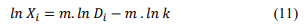 (11)where: Xi = passing weight fraction of a group of particles in the grain-size analysis; Di = nominal mean diameter of that group (μm); k = maximum particle diameter of the distribution (size modulus) that locates the distribution in overall size spectrum (μm); m = distribution modulus, that measure the broadness of the size distribution.