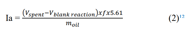 To calculate the acid number, it was necessary to measure a mass of approximately 10 g of biodiesel in a 125 mL Erlenmeyer flask. A mixture of ethyl alcohol and ethyl ether in the ratio of 2:1 by volume was prepared. Subsequently, 25 mL of this mixture was added to the Erlenmeyer flask along with 3 drops of phenolphthalein. Titration of the solution was then carried out with 0.02 mol L-1 sodium hydroxide, and the blank was titrated, that is, 25 mL of the mixture of ethyl ether and ethyl alcohol together with 3 drops of phenolphthalein without the presence of biodiesel, according to NBR 14448 12. The calculation of the acid number is performed by Eq. 2: