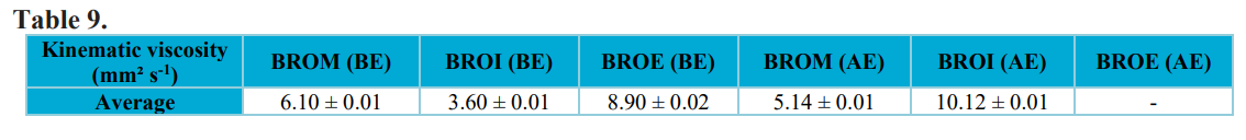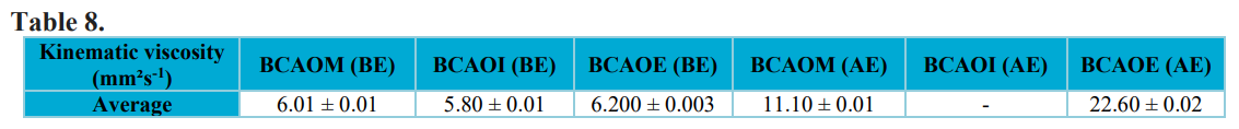 It was observed that the engine maintained the correct operating temperature, since a laser thermometer was used to carry out the temperature measurements during operation, so that there was no overheating of the engine components. Also, no smoke or anomaly was observed during or after the tests. Kinematic viscosity analyzes are listed in Tab. 7, 8 and 9, both before and after each sample for 3 h. The analyses were performed in quintuplicate and the results were given by the mean. Analyzes before the engine will be called BE and after engine AE.