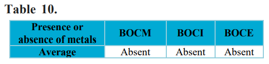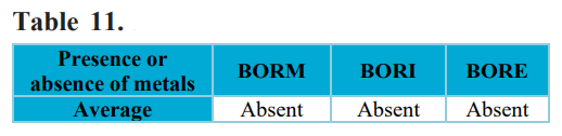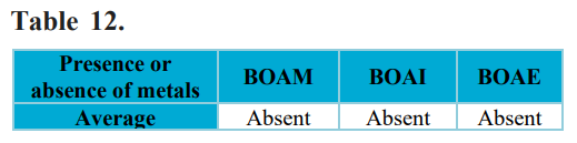 The metal detection test analyses are listed in Tabs. 10, 11 and 12 below. They were performed in triplicate and the results were given by the average.