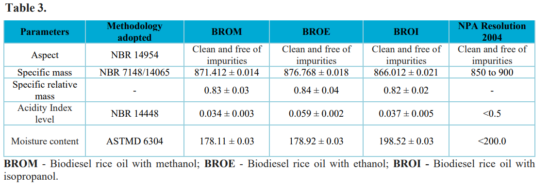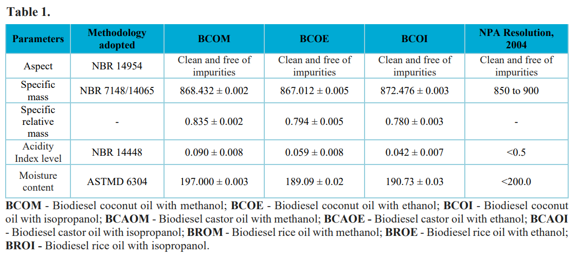 The biodiesel characterization was carried out from the results of some parameters, through which the quality of the biodiesel produced can be evaluated. The quality has a direct relation with the operation and the life of an engine, so it was possible to ascertain the quality of the biodiesel produced. According to National Agency for Petroleum, Natural Gas and Biofuels regulation 25/2014 4, in order to the product obtained to be considered a biodiesel, it must comply with some rules such as: be clear and free of impurities; have neutral pH; have density, total acidity index, moisture content and kinematic viscosity within the established limits. Tables 1, 2 and 3 present the methodologies used in each parameter, the results obtained by the analysis of coconut, castor and rice biodiesel, respectively, following the limits established by the Brazilian legislation4.