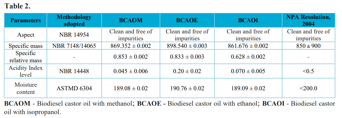 In order to characterize the biodiesel in relation to aspect and color, a preliminary analysis was carried out looking for the presence of visual impurities, such as suspended materials, sediments or any turbidity in the sample, which may be due to the presence of water. In the absence of any of these contaminants, biodiesel was classified as clear and free of impurities, according to NBR 14954 9.