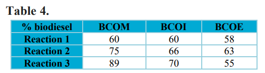 The yield calculation was useful to verify which vegetable oil and alcohol had the best yield in obtaining biodiesel, that is, how much was converted from reagent (vegetable oil) to product (biodiesel). Tables 4, 5 and 6 below indicate these yields: