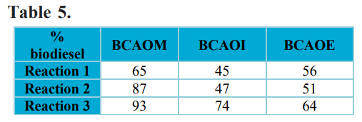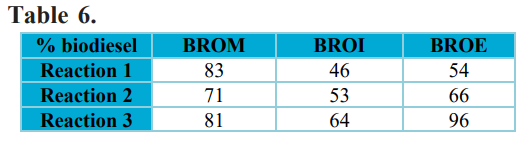 Table 6 shows that biodiesel obtained from rice oil with methanol presented high values, as expected by Charoenchaitrakool and Thienmethangkoon18, from 70 to 95%. The biodiesel obtained through the rice oil with isopropanol presented low yields, but already expected according to the chemical explanation of the carbon chain, as suggested by Geris et al.8. For the biodiesel obtained by means of the rice oil with ethanol, the yields were within the expected, with highlight to the 3rd reaction with yield of 96%, higher than expected by the limit of 50 to 80% of Charoenchaitrakool and Thienmethangkoon18. In relation to the performance of biodiesel in the engine, the yield does not directly influence. However, good yields are feasible because of the amount of 500 mL needed for the lubricant to run on the engine. A low yield means having to perform a greater amount of reaction to achieve what is required for the internal combustion engine, making the process more expensive and exhausting.
