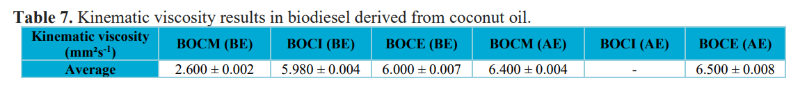 In Tab. 7, it was possible to observe that the biodiesel obtained through coconut oil before the engine showed satisfactory results, within the range of 3.0 to 6.0 mm² s-1 of the NBR4. Only the biodiesel obtained from coconut oil with methanol showed below-expected value, which is detrimental since lubricant that has low viscosity may not sufficiently protect engine parts, increasing parts wear, causing more friction and oxidizing faster, as explained by Farias et al.5..The viscosity values after the engine increased, but not excessively, which was expected due to the oxidation of the biodiesel in the engine.