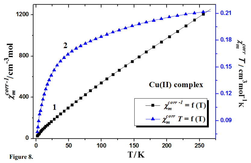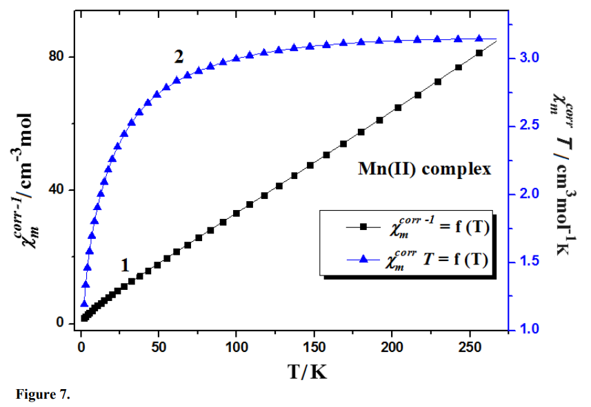 All analysed compounds demonstrate paramagnetic properties and obeyed the Curie–Weiss law. Their magnetic susceptibility values decreased with increasing temperature42-48. The dependences of magnetic susceptibility, Xmcorr, its reciprocal values and also Xmcorr*T worths as a function of temperature for Mn(II) and Cu(II) complexes are presented in Figs. 7 and 8.