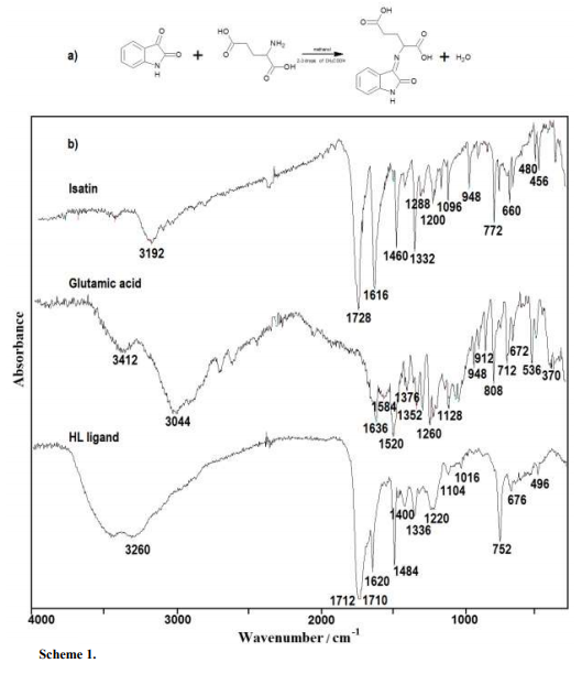 Ligand (Scheme 1) was synthesized by refluxing glutamic acid (0.01 mol L-1) (1.47 g) with isatin (0.01 mol L-1) (1.47 g) in 100 mL methanol aqueous solution (99% pure, Aldrich Chemical Company). For the reaching of equilibrium state the solids in solutions were constant heating for 2–3 h in the presence of three drops of glacial acetic acid. They were filtered off, washed with water and methanol and dried at 303 K to constant masses.