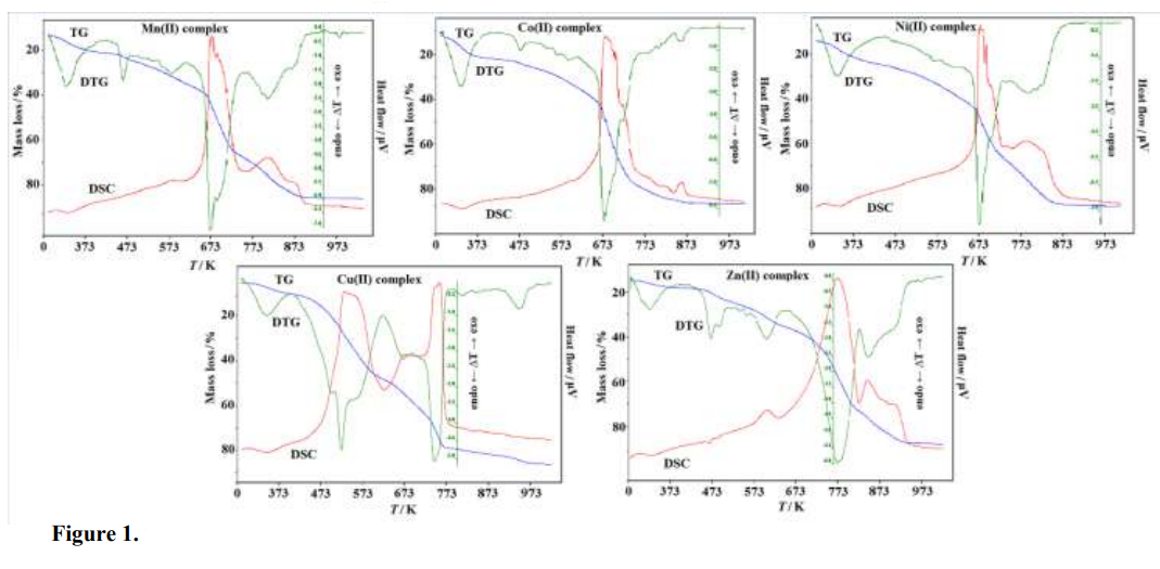 The thermal stability and decomposition of the complexes were studied in air using a Setsys 16/18 (Setaram) TG, DTG and DSC instrument. The experiments were carried out under air flow rate of 20 mL min-1 in the range of 297 – 1173 K at a heating rate of 5 K min-1. The initial masses of samples used for measurements changed from 7.85 to 4.09 mg and were heated in Al2O3 crucibles.