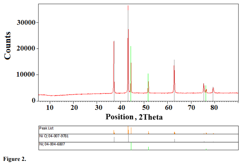 The complexes are stable up to 310–323 K. In the range of 310 – 414 K they dehydrate with an endothermic effect losing all water molecules. The found enthalpy values for one water molecule of dehydration process change from 10.31 to 37.78 kJ mol-1. On further heating of compounds at 413 – 1013 K the oxycarbonates, M2OCO3 of the corresponding metals were formed31 but in the case of Ni(II) and Zn(II) complexes the mixtures of Ni2OCO3 and Zn2OCO3 with NiO and ZnO were identified. The final products of complex decompositions were following oxides: MnO2, CoO, NiO, CuO and ZnO. They were identified by X-ray analysis data. For example Fig. 2 presents the diffractogram of the final product of Ni(II) compound decomposition.