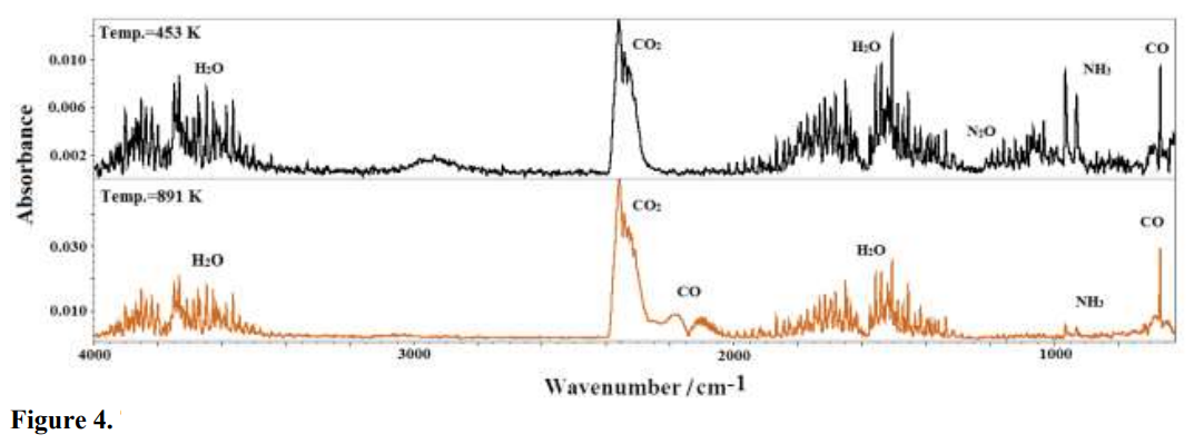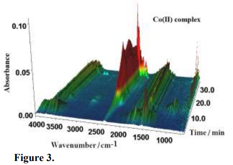 1000 cm-1 derived from the rocking vibrations of C–H resulting from the (CH3)2N moiety are observed34,35. Another volatile products of Co(II) compound thermal decomposition in nitrogen are hydrocarbons. Therefore FTIR spectrum contains the bands at 3300 – 3100 cm−1, 1700 – 1650 cm−1 and 1500 – 1400 cm−1 coming from their molecule stretching vibrations34,35. Above 700 K the bands at 2200 – 2100 and 800 cm−1 resulting from carbon monoxide vibrations occur. Their highest intensities appear after 30 minutes of heating34.