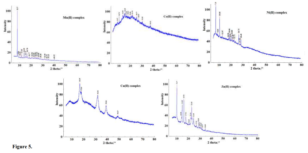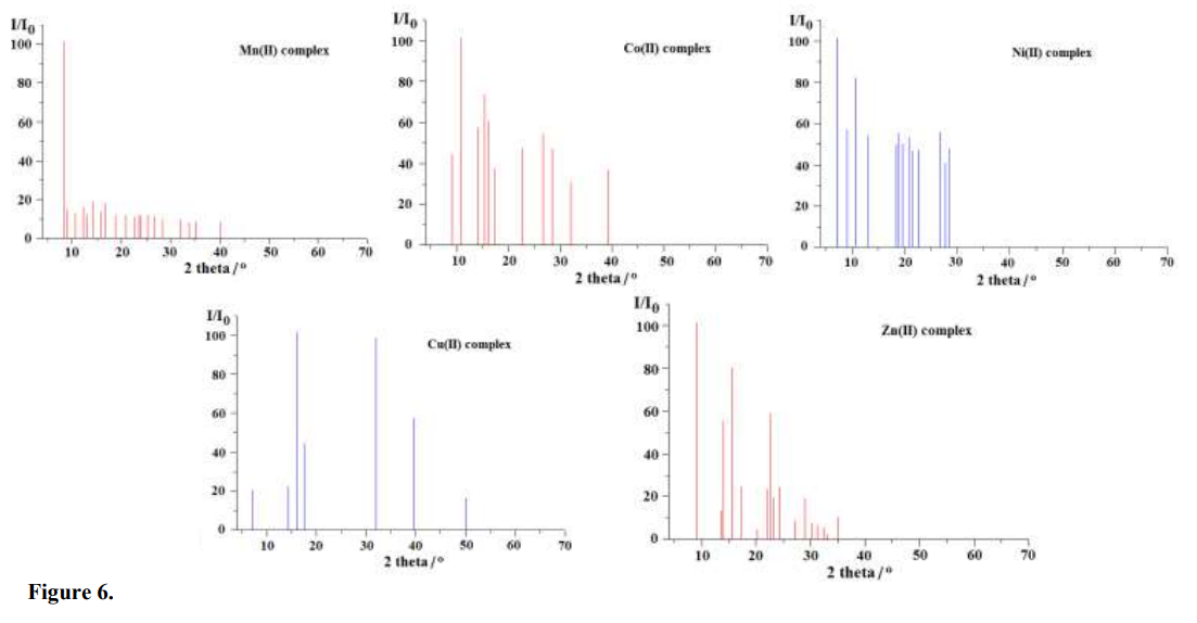 Due to the lack of monocrystals of analysed compounds suitable for measurements, estimation of the unit cell parameters was carried out applying the Dicvol06 programme36,37 (Tab. 2) using the X–ray powder diffraction data. According to the obtained results all analysed complexes were found to form low symmetry compounds. The complexes of Mn(II), Co(II), Cu(II) and Zn(II) crystallized in monoclinic system while that of Ni(II) in triclinic one36,37. All experimental data (angular values and lattice constants of primitive cell) are showed in Tab. 2. The X-ray diffraction patterns and dependences of I/I0 vs. 2θ of analysed complexes are presented in Figs. 5 and 6.