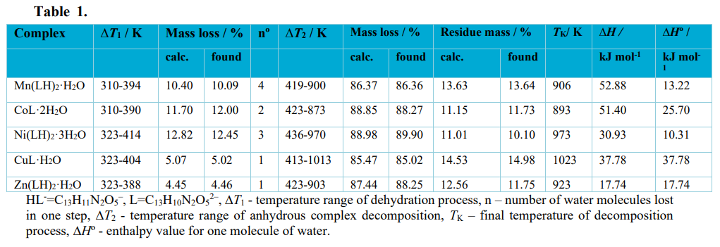 The coordination number values of central ion depend mainly on the kind of cation32,33. In order to determine them it is necessary to estimate the positions of water molecules in analysed compounds. Not having monocrystal structure data of compounds we can only estimate them taking into account their initial dehydration process temperature values. If water molecules are lost in one step below 423 K they may form outer sphere water32. However, if they are coordinated weakly with central atom, they may be released also at low temperature indicating this way their outer sphere character. Then in the presented complexes it is difficult to state if water molecules are in outer or inner coordination positions.