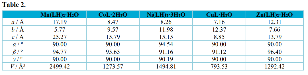 X–Ray powder diffraction of Mn(II), Co(II), Ni(II), Cu(II) and Zn(II) complexes indicated them to be a crystalline compounds. A number of crystallization trials to obtain the single crystals of analysed complexes with several different solvents (such as H2O, alcohols, DMSO, DMF and acetonitrile) have been carried out. The compounds were dissolved in pure solvent as well as in solvent mixture. Crystallization test were performed both at room temperature and at 8 ºC.