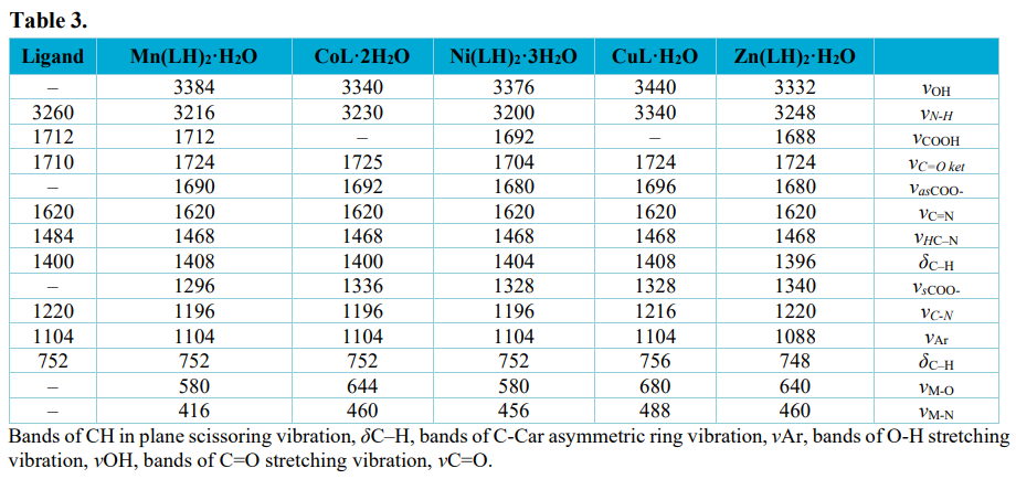 There are some new bands present in the spectra of compounds not being seen in the ligand IR spectrum. The bands at 680 – 580 cm-1 confirmed the presence of the metal ion–oxygen bonds in complexes38,39. Their various frequency values may suggest the different stability of M–O bonding. The M–N stretching vibration bands, ν(M–N), in the IR complex spectra appearing at 488 – 416 cm-1 indicate the ion metal coordination with nitrogen atom40,41.