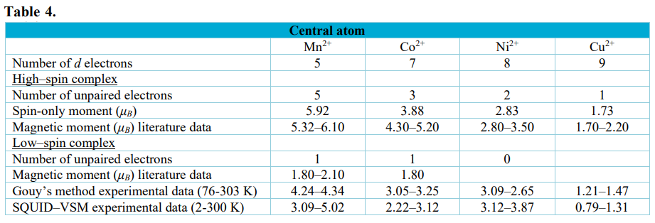 At a high temperature region, the magnetic moment values approached the theoretical values Tab. 4. They seem close to spin only values which were calculated at room temperature from the equation µeff=[4s(s + 1)]1/2 for Mn(II), Co(II), Ni(II) and Cu(II) ions and are equal to 5.92; 3.88; 2.83 and 1.73 µB, respectively.