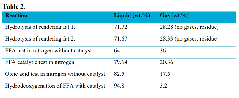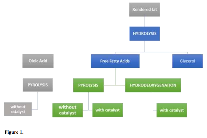 For hydrolysis of rendering fat, HDO and pyrolysis tests similar procedures were performed. Three types of tests were carried out: