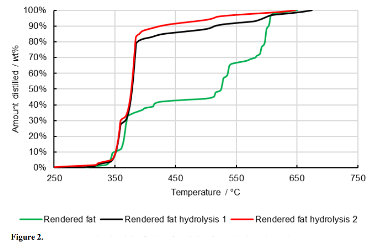 Two tests with similar results (Tab. 2) were carried out. The simulated distillation of the FFA product presented about 90 wt.% of pure FFA (Fig. 2). After hydrolysis tests no gaseous samples (C1-C4 gases) were produced. Glycerol and organic phases were separated by centrifugation. The organic phase SIMDIS is shown in Fig. 2.