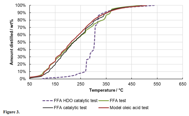 HDO test clearly showed four main increments of the amount distilled at 270, 286, 305 and 318 °C which are related to C15-C18 hydrocarbons, respectively. Two significative increments of amount distilled were also shown for catalytic FFA pyrolysis tests (C15 and C17 hydrocarbons zone) indicating that the use of the metal sulfide catalyst led to a higher amount of C15, C17 hydrocarbons. However, in pyrolysis no hydrogen was used so these hydrocarbons could be produced by the hydrogen produced by the initial FFA hydrogen loss originated during the test.