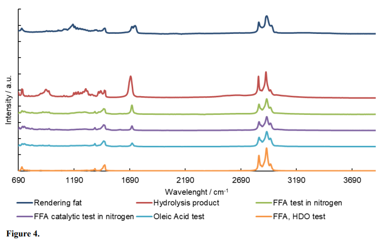 The pyrolysis led to an effective conversion to liquid and gaseous products different than feedstock as shown in Fig. 3. The SimDis and RGA analyses together demonstrated that the pyrolysis was effective producing lighter products compared to the free fatty acids (FFA) due to a cracking process. As shown in Tab. 2, the use of a sulfide catalyst increased the light liquid production and decreased the number of gaseous products C1-C6. The amount of gases and liquids compared between FFA and oleic acid tests are different due to the presence of other FFA in the animal fat (not only oleic acid). HDO test clearly led to hydrocarbons (Fig. 3) especially to products C15-C18 according to calibrated RGA methodology peaks. This result is confirmed by ATR (Fig. 4) not showing signals for oxygenated compounds.