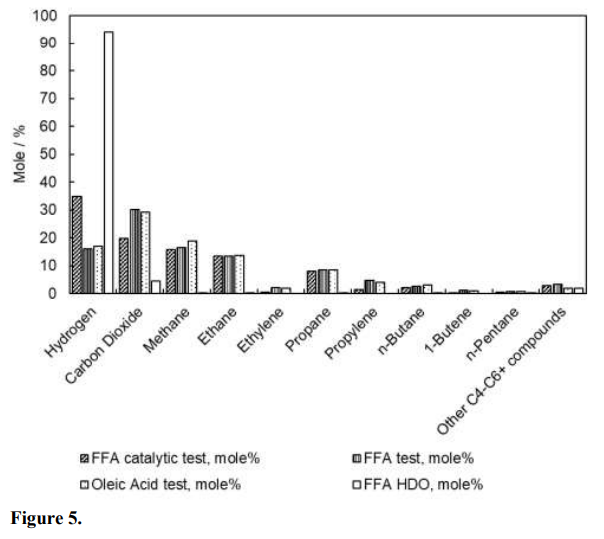 Next, after obtaining the FFA, two tests were carried out with FFA. One test using sulfide commercial catalyst and one test without catalyst. Oleic acid was also used as model molecule to perform a pyrolysis test for comparing results with those obtained using FFA from RF.