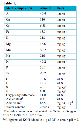 Waste RF (from dead animals, pig (80 wt.%) also including chicken (14 wt.%) and cow (6 wt.%) residues) used in a previous work7 was analysed (metal and elemental C, H, N, S analyses) as shown in Tab. 1.