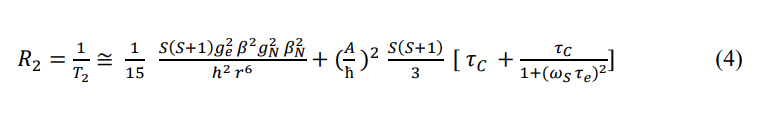 Observing Eqs. 1 and 2, we have that the longitudinal relaxation time (T1) depends on several parameters, such as: the electron spin (S), the electronic (ge) and proton g factors (gN), the Bohr magneton (β), the nuclear magneton (β.), the hyperfine coupling constant (A), the ion-nucleus distance (r), and the Larmor frequencies for the proton (𝜔𝐼) and electron spins (𝜔𝑆), 𝜏𝑒 is the correlation time that characterizes the time of internal rotational correlation of molecules. In the Eq. 2, besides the constants already mentioned we also have 𝜏𝑐 , which is the correlation time characterized by the rate of change of the ion interactions between metal and neighboring hydrogens. In these equations it is important to highlight the hyperfine coupling constant, which is the most sensitive parameter and what our calculations were performed21.