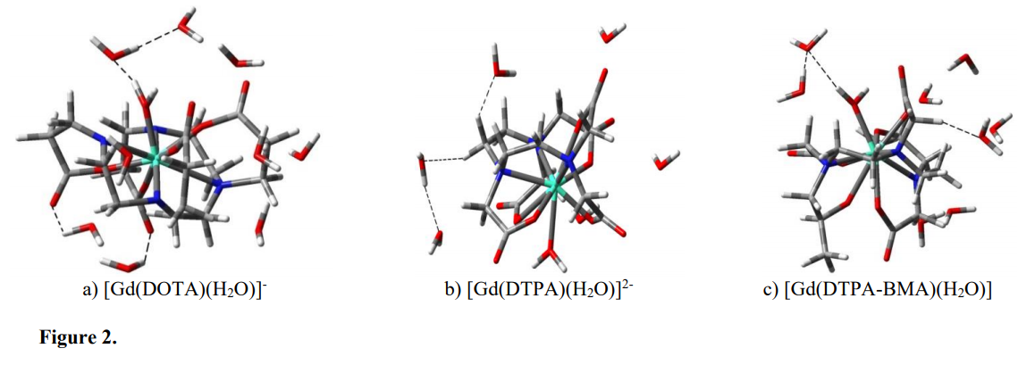 Analyzing the last complex of work (Tab. 4), [Gd(DTPA-BMA)(H2O)], the equilibrium structure, A𝑖𝑠𝑜 eq (PBE1PBE(H2O)//PBE1PBE(H2O)), the values obtained were 0.33 MHz for the 1H and 0.89 MHz for the 17O, and calculations with the implicit solvent and explicit A𝑖𝑠𝑜 eq ( PBE1PBE (H2O)/PCM// PBE1PBE (H2O)), the values obtained were of 0.55 MHz for the 1H and 0.75 MHz for the 17O. Calculations with uncorrelated structures of the MD, A𝑖𝑠𝑜 300K (MD(H2O)//MD(H2O)), the values obtained were 0.95 MHz for the 1H and 0.72 MHZ for the 17O. The thermal effects were important, the Aiso values were closer to the experimental. In Fig. 2 are shown the structures of Gd(III) complexes with different ligands. As noted, in both cases ([Gd(DOTA)(H2O)]- and [Gd(DTPA)(H2O)]2- ) in both cases ([Gd(DOTA)(H2O)]- and [Gd(DTPA)(H2O)]2- ) the thermal effects were important. With the incessant movement of water molecules, more interactions can occur between the solvent and the solute and between solvent molecules (such as hydrogen bonds). These interactions are the main responsible for the considerable increase in Aiso values. The fact, thermal effects are important because they consider the movement of all solvent molecules, thus, this model is considered more realistic.