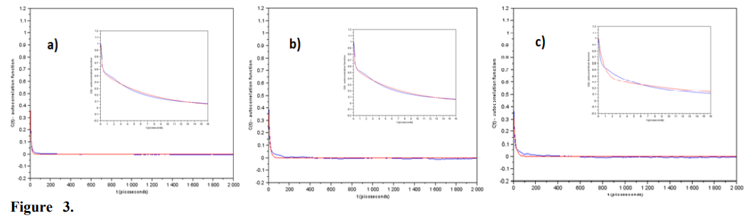 From the simulation MD, as can be seen in Fig. 3, the correlation time of the complex coordinated with water molecules ([Gd(DOTA)(H2O)]-, [Gd(DTPA)(H2O)]2- and [Gd(DTPA-BMA)(H2O)] were 4.09, 6.01 and 6.53 ps, respectively. According to the calculations of statistical inefficiency for the complex [Gd(DOTA)(H2O)]- 244 structures were uncorrelated, for the [Gd(DTPA)(H2O)]2- 164 structures were uncorrelated and for the complex [Gd(DTPA-BMA)(H2O)] 153 structures were uncorrelated. We observed that the complex [Gd(DTPA-BMA)(H2O)] has a larger correlation time relative to other complexes, thus has a smaller number of uncorrelated structures.